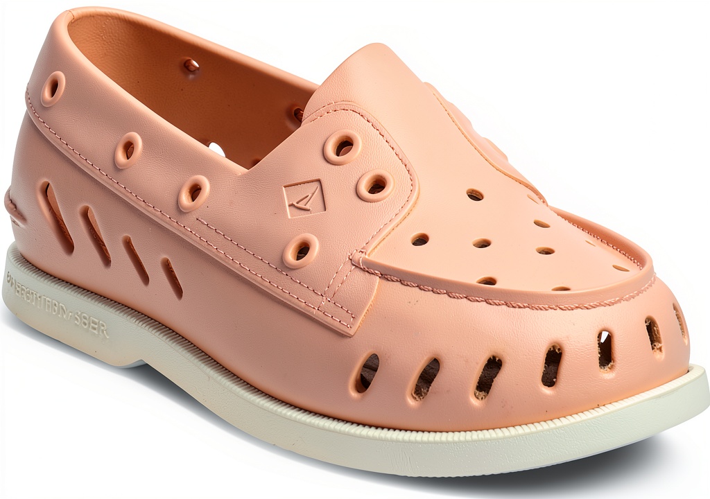 The Sperry Womens Authentic Original Float loafers are crafted with super lightweight injected EVA material, ensuring comfort and flexibility for daily wear. Strategically placed drainage gills along the waterline allow water to escape quickly, while breathable portholes on the topside enhance airflow. The molded wave-siping pattern on the outsole provides improved traction on both wet and dry surfaces, making these shoes reliable in various conditions. Available in a Blush color and multiple sizes from 5 to 11, they feature a slip-on design that combines style with functionality. Manufactured by Sperry, a trusted name in footwear, these loafers are backed by a product warranty and have garnered positive customer reviews for their seaworthy performance.