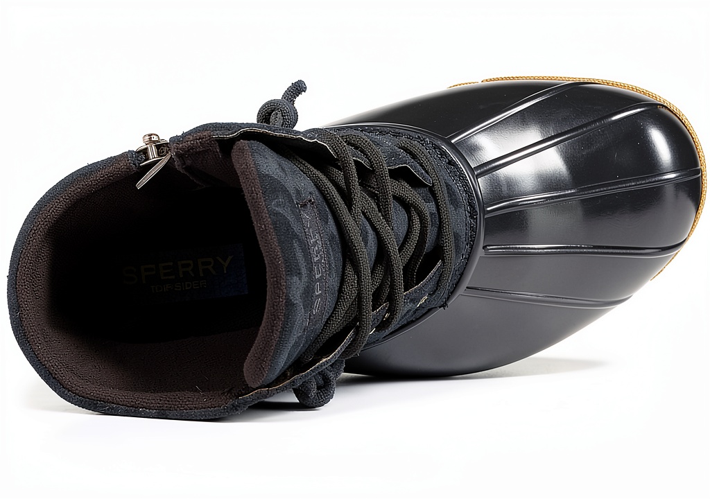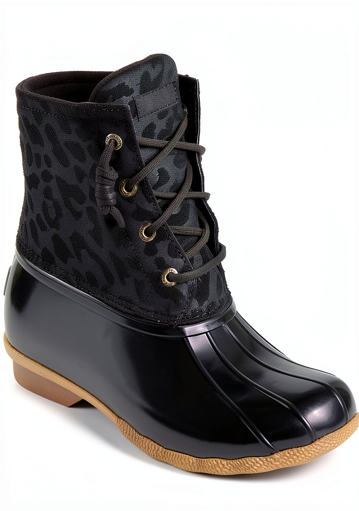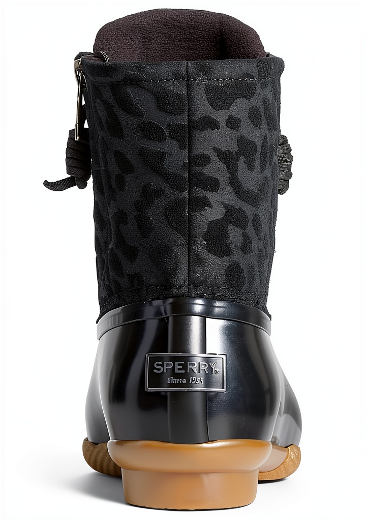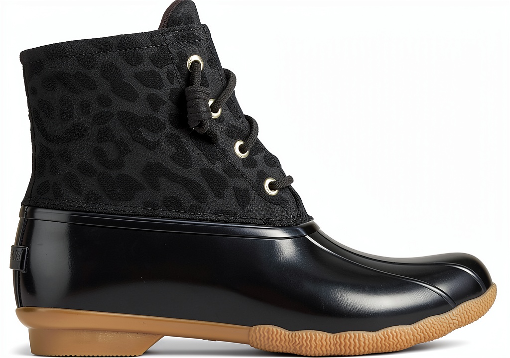 The Sperry womens Saltwater Cheetah Duck Boot is a versatile all-weather boot crafted for durability and comfort. It features a waterproof rubber duck shell that shields feet from moisture, while the rawhide barrel lacing with zipper entry allows for easy on and off. Built with Sperry’s signature Wave-Siping technology on the outsole, it delivers exceptional stability and traction on slippery surfaces. Available in black and multiple sizes from 5 to 11, this boot combines rugged materials with a sleek design, making it a top choice for women seeking reliable footwear.