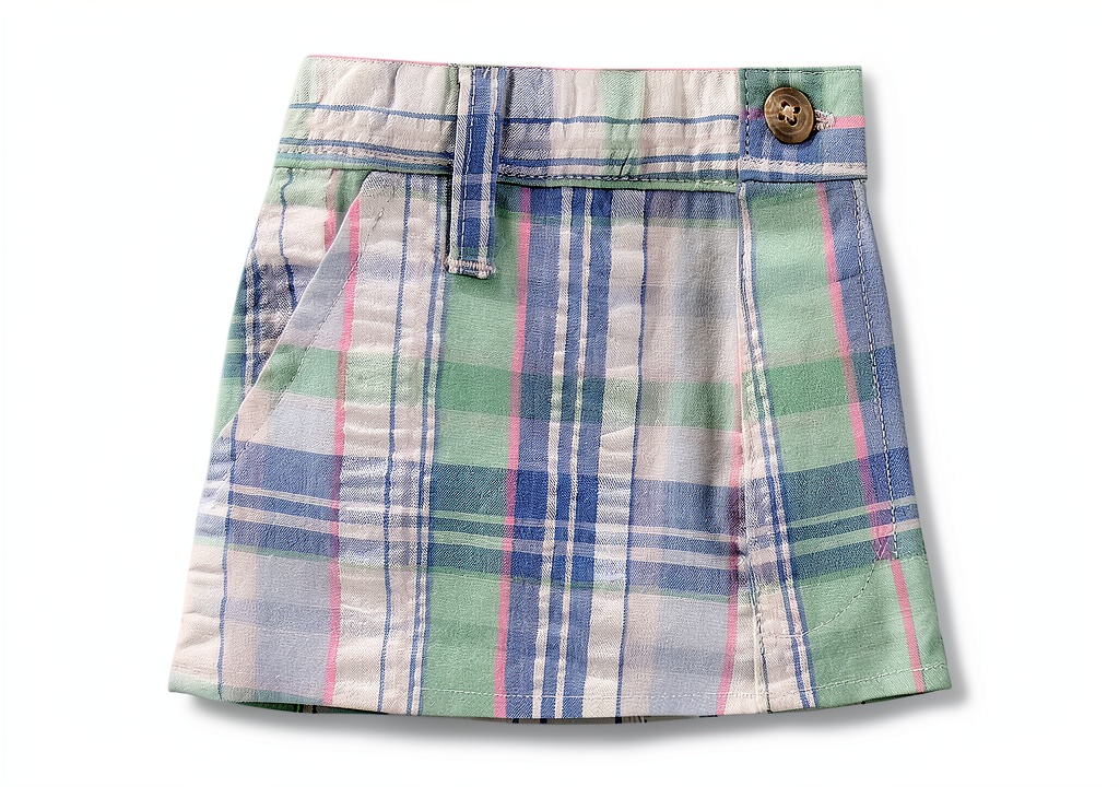 - Classic 2-piece design with a beige woven shirt and multicolored shorts for a timeless nautical look
